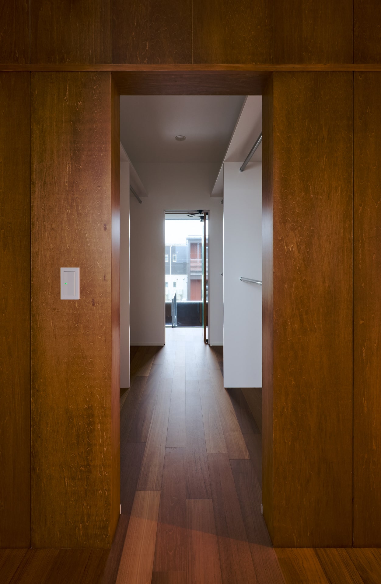 店舗併用住宅の店舗部分と住宅部分を切り離し、住宅部分のみを建て替えたプロジェクトである。両親+4人家族の住まいとして計画しているが、将来的な家族構成の変化も考慮し、1階を賃貸物件にする可能性も視野に入れ、下階を親世帯、上階を子世帯とした完全分離型の二世帯住宅となっている。ファサードは<壁>と<穴>が互い違いとなり市松模様を形成しているが、3台分のインナーガレージが必要という要望に対して木構造の現実を落とし込むことと、2階玄関へ至る外部階段、さらに各階LDKに明るさを届ける必要性から発想している。2階子世帯の間取りはキッチンとファミリークロークを核とし、その他の諸室が廊下により繋がることで機能的な回遊動線となっている。また、インテリアはクライアントの好みであるミッドセンチュリーモダンに調和するよう素材や色が丁寧に選定されている。アイコニックな市松模様のファサードや、ミッドセンチュリー家具が映えるクラシックなインテリア、また生活を支える機能的な平面計画を共存させる事で、ReeLの熱烈なファンであるクライアントの期待にしっかりと応えることが出来た。